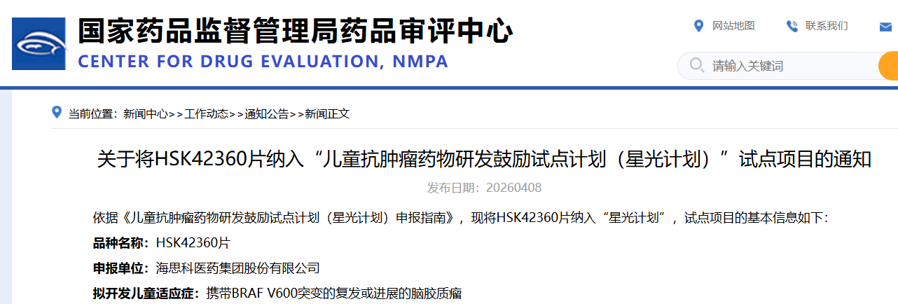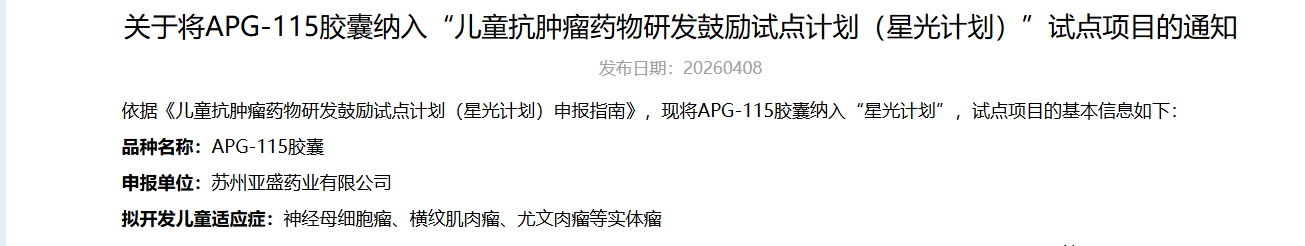 4 月 8 日,CDE 宣布,将海思科 HSK42360 片、亚盛医药 APG-115 胶囊纳入「星光计划」。CDE 「星光计划」旨在就抗肿瘤药物儿童人群研究过程中技术难点提供针对性指导,提高儿童抗肿瘤药物的研发效率。