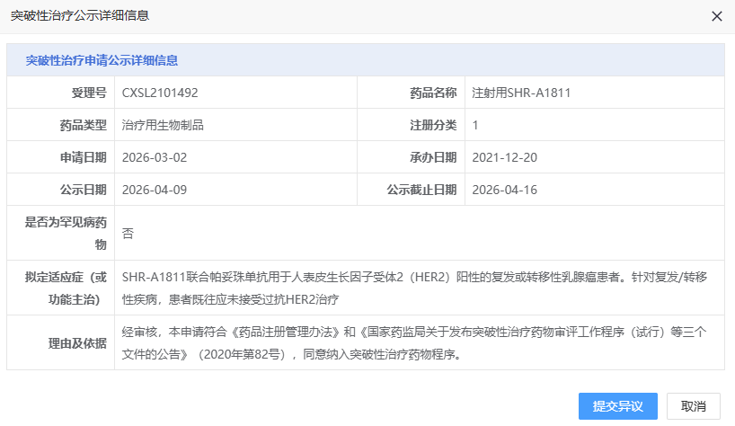 4 月 9 日,CDE 官网显示,恒瑞 1 类新药注射用 SHR-A1811(瑞康曲妥珠单抗)拟被纳入突破性疗法,联合帕妥珠单抗用于人表皮生长因子受体 2(HER2)阳性的复发或转移性乳腺癌患者,针对复发/转移性疾病,患者既往应未接受过抗 HER2 治疗。