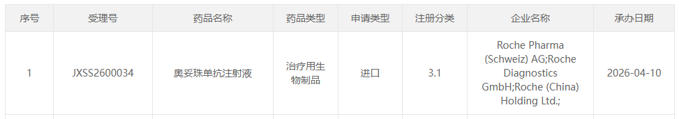 4 月 10 日,CDE 官网显示,罗氏奥妥珠单抗注射液的一项新适应症上市申请获得受理,本次申报类型为治疗用生物制品 3.1 类,即境外生产的境外已上市、境内未上市的生物制品申报上市。根据公开资料及临床试验进展,Insight 数据库推测其适应症为狼疮肾炎。