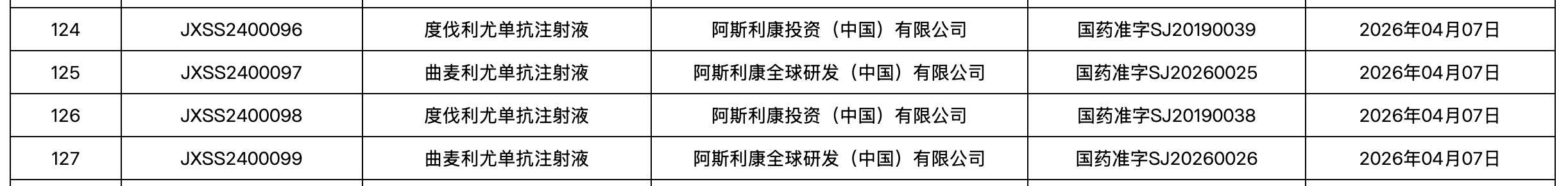 4 月 10 日,NMPA 官网显示,阿斯利康度伐利尤单抗(PD-L1)和曲麦利尤单抗(CTLA4)联合疗法在国内获批上市。根据该药物此前国外获批适应症和临床研究,Insight 数据库推测该适应症是两药联合用于一线治疗驱动基因阴性的非小细胞肺癌(受理号:JXSS2400096/7/8/9)。