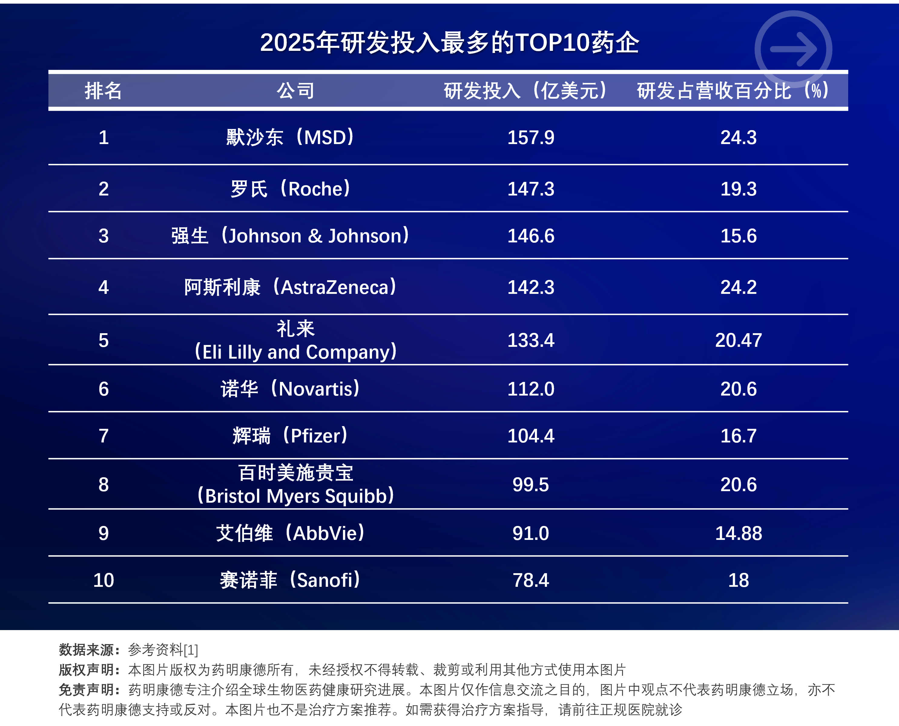 ▲2025年研发投入最多TOP 10生物医药公司(图片来源:根据参考资料[1]制表)